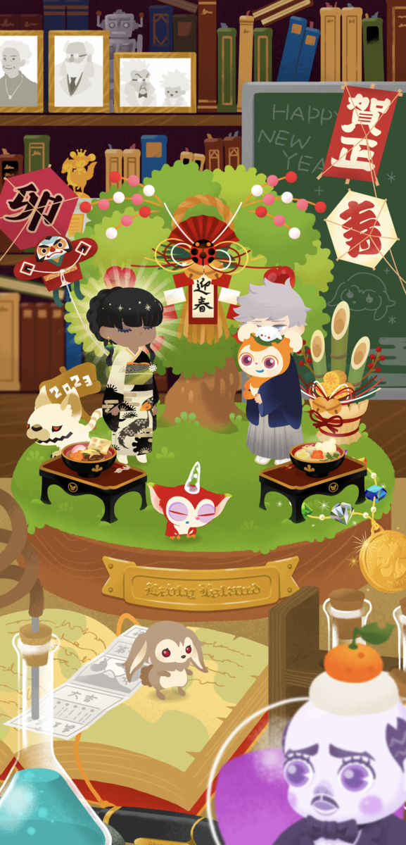 アキラ所長のアイランドでは着物姿のアキラ所長とラビネ雪だるまのアクセをつけたニューニューちゃん(ニューニューちゃん専用アイテムですが、私はこのアクセサリーがずっと欲しいと思っています)、干支リヴリーのビャッコとラビネちゃんがいます。