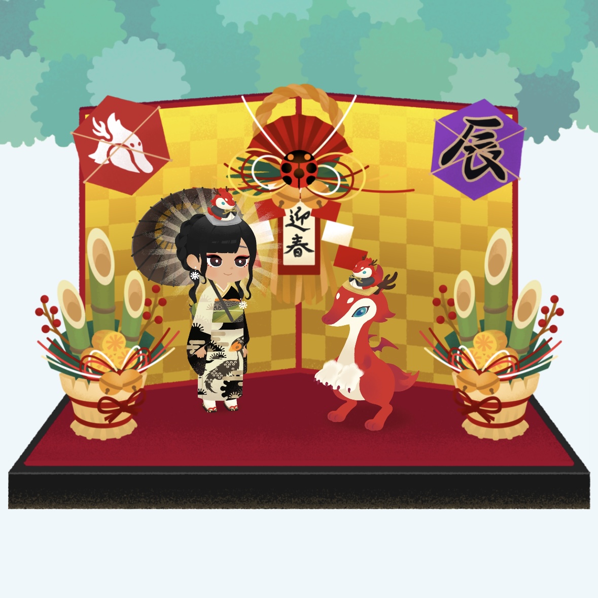 2022度からある金屏風の飾り。今年は辰年の凧がついています。