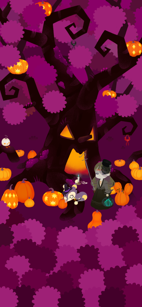 ハロウィンの巨木にたどり着きます。クロモリとアカモリがぶら下がっているのがかわいいですね。